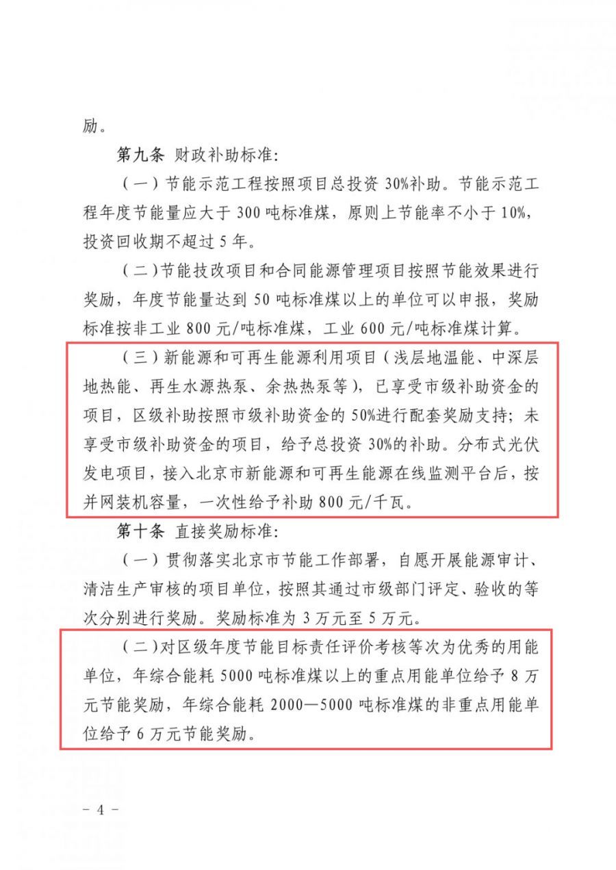 通知明確:新能源和可再生能源利用項目已享受市級補助資金的項目,區級補助按照市級補助資金的50%進行配套獎勵支持;未享受市級補助資金的項目,給予總投資30%的補助。分布式光伏發電項目,接入北京市新能源和可再生能源在線監測平臺后,接并網裝機容量,一次性給予補助800元/千瓦