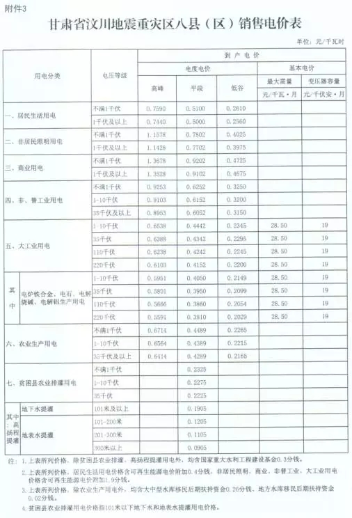 3:甘肅省汶川地震重災(zāi)區(qū)八縣(區(qū))銷售電價(jià)表