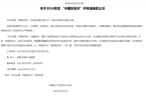 “中國好技術(shù)”是為深入貫徹落實黨中央、國務院關(guān)于實施創(chuàng)新驅(qū)動發(fā)展戰(zhàn)略和“大眾創(chuàng)業(yè)、萬眾創(chuàng)新”的精神,不斷激發(fā)全社會的創(chuàng)新創(chuàng)業(yè)活力,營造全民創(chuàng)新的良好氛圍,由中國生產(chǎn)力促進中心協(xié)會同國家相關(guān)機構(gòu)和企業(yè)共同發(fā)起和舉辦的,此獎項評選為每年一次。在2016年度“中國好技術(shù)”征集中,得到了全國各級生產(chǎn)力促進中心和相關(guān)企業(yè)的大力支持,共征集科技創(chuàng)新產(chǎn)品和可產(chǎn)業(yè)化技術(shù)成果286項,獲得“中國好技術(shù)”稱號有108個項目。評審“中國好技術(shù)”這項工作的目的,就是要把蘊藏在民間的好技術(shù)變成好產(chǎn)品,把好產(chǎn)品推向國內(nèi)外市場,讓中國的好產(chǎn)品變成中國的好品牌,讓中國的好品牌產(chǎn)生巨大經(jīng)濟效益和社會影響。讓“中國好技術(shù)”服務和支持“一帶一路”引領下的世界經(jīng)濟發(fā)展新格局,讓“中國好技術(shù)”走出國門,走向世界。
