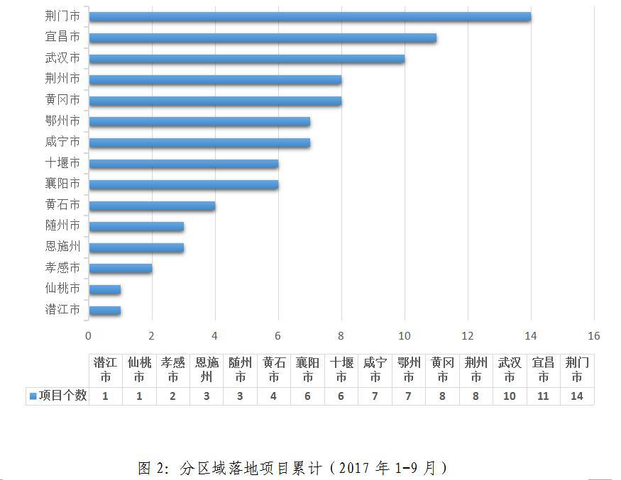 2017年1-9月,累計(jì)新落地項(xiàng)目數(shù)排名:荊門市(14個(gè))、宜昌市(11個(gè))、武漢市(10個(gè))、荊州市(8個(gè))、黃岡市(8個(gè))、荊州市(8個(gè))、鄂州市(7個(gè))、咸寧市(7個(gè))、十堰市(6個(gè))、襄陽市(6個(gè))、黃石市(4個(gè))、隨州市(3個(gè))、恩施州(3個(gè))、孝感市(2個(gè))、仙桃市(1個(gè))、潛江市(1個(gè))。
