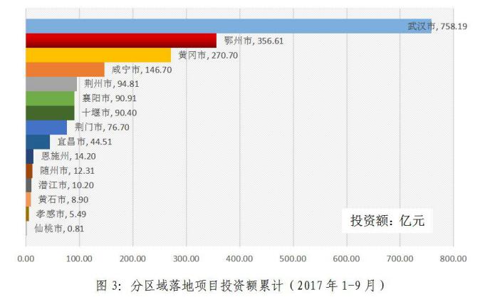 2017年1-9月,累計(jì)新落地項(xiàng)目投資額排名:武漢市(758.19億元)、鄂州市(356.61億元)、黃岡市(270.70億元)、咸寧市(146.70億元)、荊州市(94.81億元)、襄陽市(90.91億元)、十堰市(90.40億元)、荊門市(76.70億元)、宜昌市(44.51億元)、恩施州(14.20億元)、隨州市(12.31億元)、潛江市(10.2億元)、黃石市(8.90億元)、孝感市(5.49億元)、仙桃市(0.81億元)。