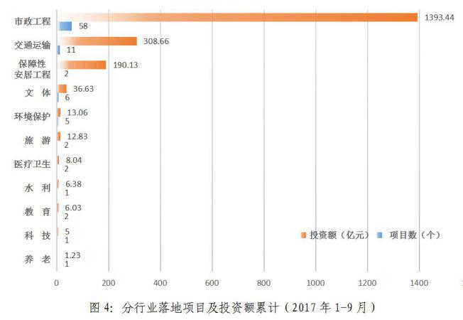 2017年1-9月,累計(jì)新落地項(xiàng)目數(shù)排名:市政工程(58個(gè))、交通運(yùn)輸(11個(gè))、文體(6個(gè))、環(huán)境保護(hù)(5個(gè))、保障性安居工程(2個(gè))、醫(yī)療衛(wèi)生(2個(gè))、教育(2個(gè))、旅游(2個(gè))、養(yǎng)老(1個(gè))、水利(1個(gè))、科技(1個(gè))。