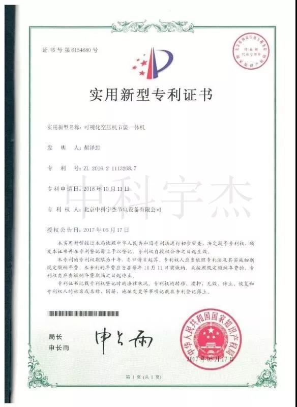 ?中科宇杰“可視化空壓機節(jié)能一體機”專利證書: