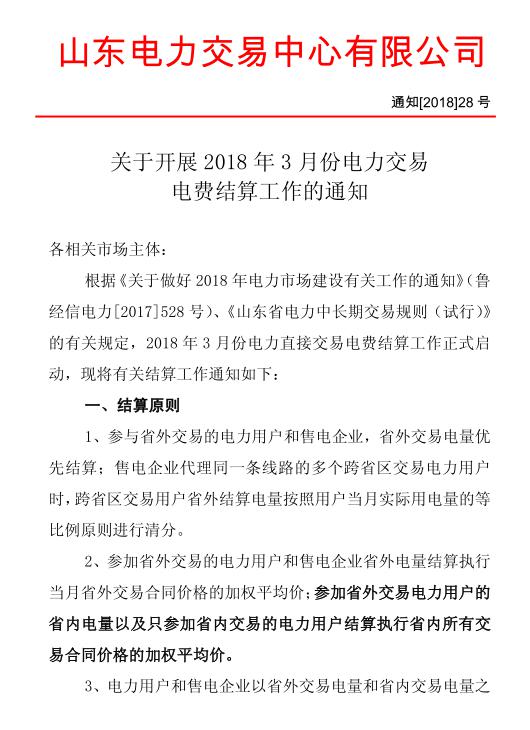 日前,山東電力交易中心發布《關于開展2018奶奶3月份電力交易電費結算工作的通知》(以下簡稱“通知”)。通知中稱,參與省外交易的電力用戶和售電企業,省外交易電量優先結算。參加省外交易電力用戶的省內電量以及只參加省內交易的電力用戶結算執行省內所有交易合同價格的加權平均價。詳情如下: