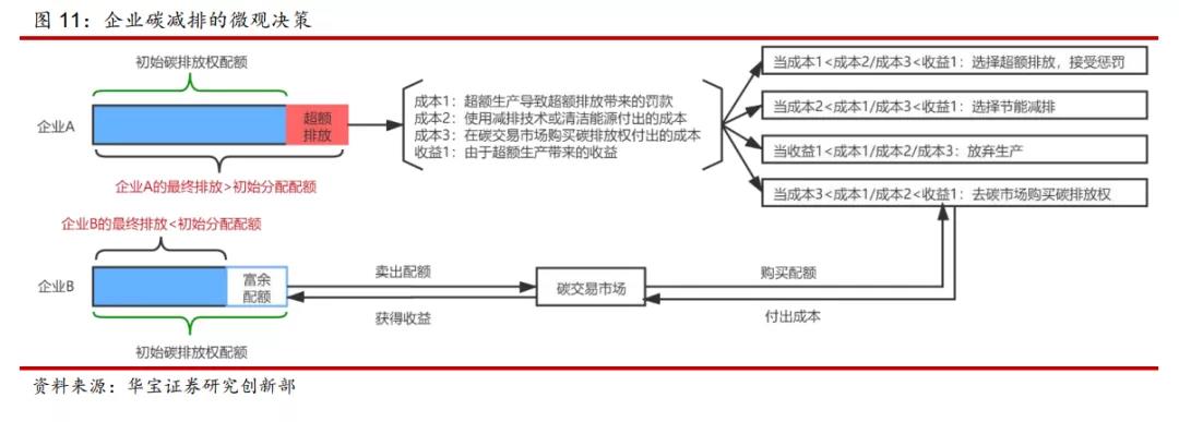 按照華寶證券的分析,有效碳市場的碳排放權的價格就是企業的邊際減排成本。在企業微觀決策上,主要是將碳減排成本、超額碳排放成本、購買碳配額的成本與超額排放生產帶來的收益進行比較,并作出相應決策。