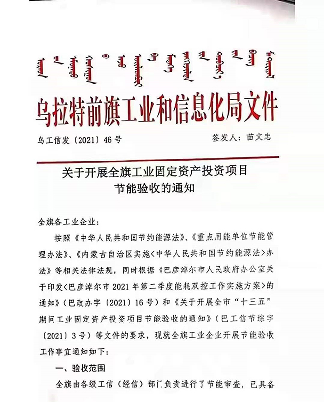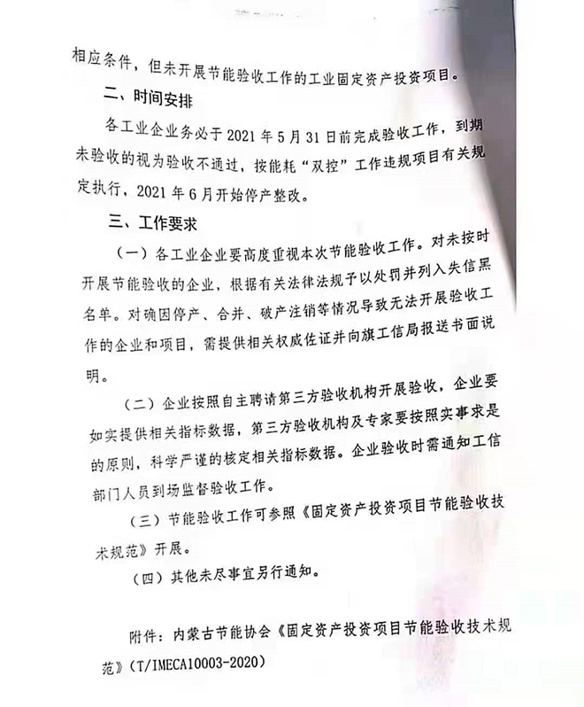烏拉特前旗:對全旗工業企業開展節能審查驗收,對期限內驗收不通過的企業,按能耗“雙控”工作違規項目有關規定執行停產整改。