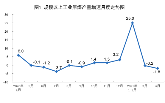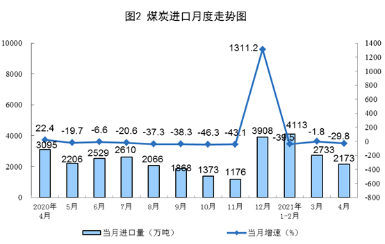 原煤生產有所下降。4月份,生產原煤3.2億噸,同比下降1.8%,比2019年4月份增長4.0%,兩年平均增長2.0%,日均產量1074萬噸;進口煤炭2173萬噸,同比下降29.8%。