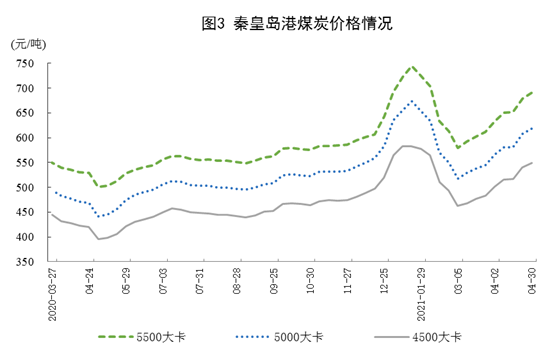 ? ? ? 港口煤炭綜合交易價格持續上漲。4月30日,秦皇島港5500、5000和4500大卡煤炭價格分別為每噸690元、618元、549元,比4月2日分別上漲56元、51元和47元。