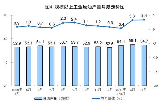 ? ? ? ?原油生產平穩,加工量保持增長。4月份,生產原油1641萬噸,同比增長3.4%,比2019年4月份增長4.3%,兩年平均增長2.1%,日均產量54.7萬噸。加工原油5790萬噸,同比增長7.5%,比2019年4月份增長8.3%,兩年平均增長4.1%,日均加工193.0萬噸。