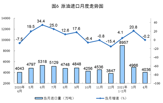 1-4月份,生產原油6563萬噸,同比增長1.9%,比2019年1-4月份增長3.9%,兩年平均增長1.9%;加工原油23210萬噸,同比增長14.2%,比2019年1-4月份增長10.3%,兩年平均增長5.0%。