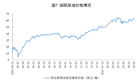 ? ? ? ?原油進口由升轉降,國際原油價格有所上漲。4月份,進口原油4036萬噸,同比下降0.2%;1-4月份,進口原油17958萬噸,同比增長7.2%。4月30日布倫特原油現貨離岸價格為67.73美元/桶,比3月31日的63.52美元/桶上漲6.6%。