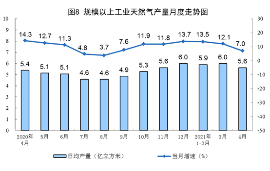 ? ?天然氣生產保持穩定增長。4月份,生產天然氣169億立方米,同比增長7.0%,比2019年4月份增長22.3%,兩年平均增長10.6%,日產5.6億立方米。