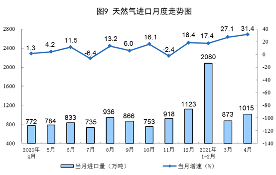 天然氣進口增速加快。4月份,進口天然氣1015萬噸,同比增長31.4%。1-4月份,進口天然氣3946萬噸,同比增長22.4%。