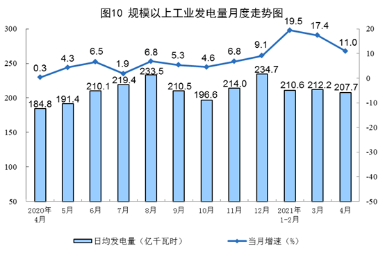 ? ? ? ?電力生產較快增長。4月份,發電6230億千瓦時,同比增長11.0%,比2019年4月份增長11.3%,兩年平均增長5.5%,日均發電207.7億千瓦時。1-4月份,發電25276億千瓦時,同比增長16.8%,比2019年1-4月份增長10.9%,兩年平均增長5.3%。