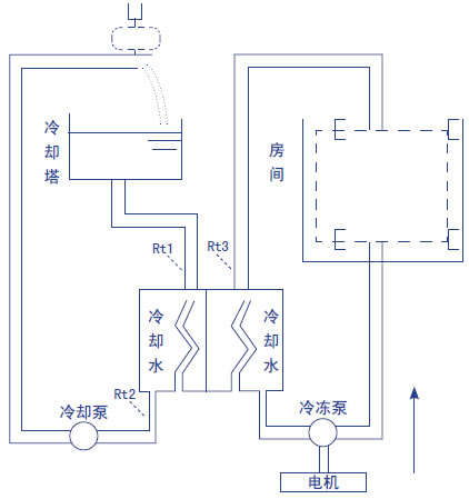 由冷卻泵、冷卻水管道及冷卻塔組成。冷凍機組進行熱交換使冷凍水溫度降低的同時,必將釋放大量的熱量。熱量釋放到冷卻水中,使冷卻水溫度升高。冷卻泵將升了溫的冷卻水壓入水塔,使之在冷卻塔中與大氣進行熱交換,然后再將降了溫的冷卻水,送回到冷凍機組,如此不斷循環(huán),帶走冷凍機組內(nèi)釋放的熱量。